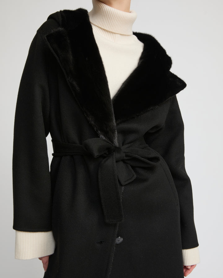 Elevate your black designer coat with thoughtfully chosen accessories. A removable Yves Salomon hood adds texture and protection, while a statement hat or cap can define your personal style and complete your accessory collection.