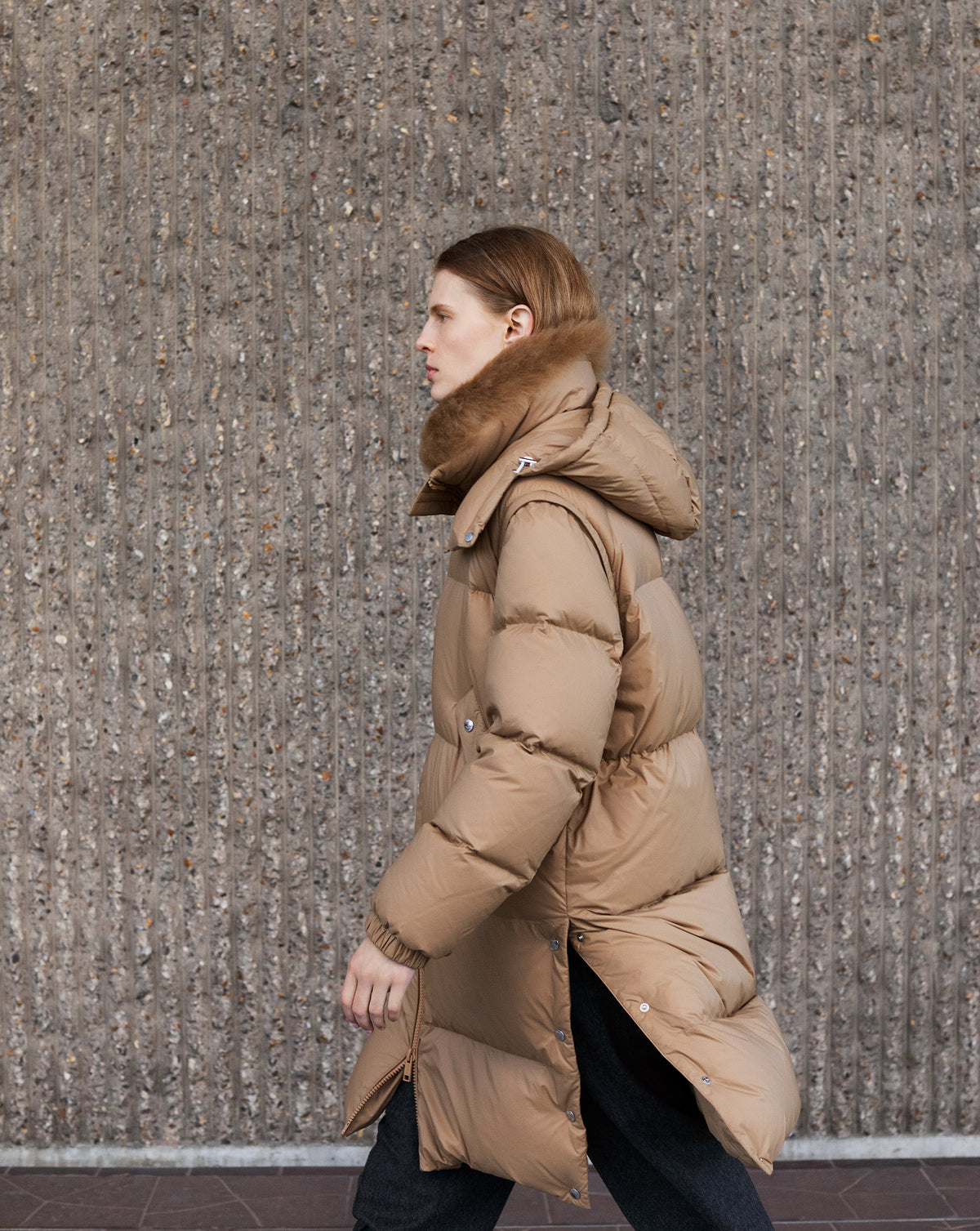 • Long belted down jacket in technical fabric with detachable fox fur collar