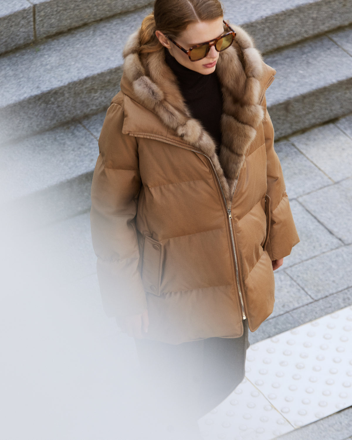 • Short hooded down jacket with mink fur inner hood and removable mittens