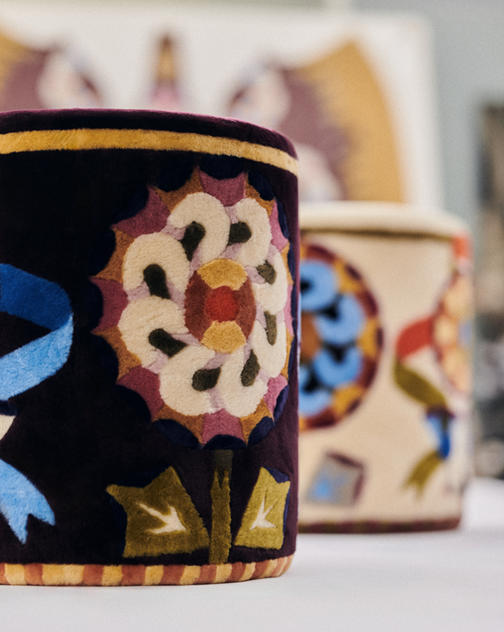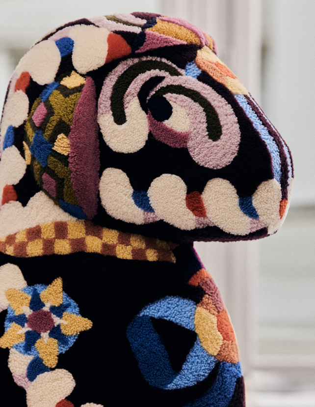 Unveiled in the covered medieval courtyard of the via Santo Spirito 7 in the heart of Milan, the whimsical collection consists of seats, blankets, stools, cushions and a lamp that each radiate with Pierre Marie’s singular ornamental vision brought to life with meticulous craftsmanship.