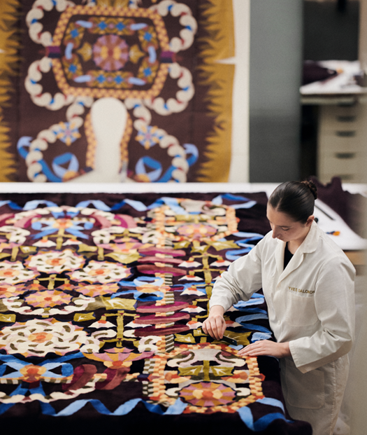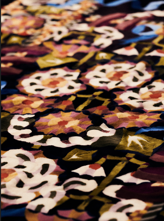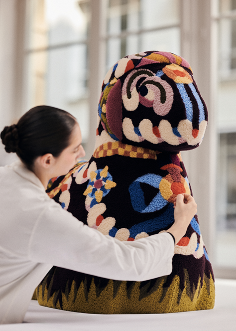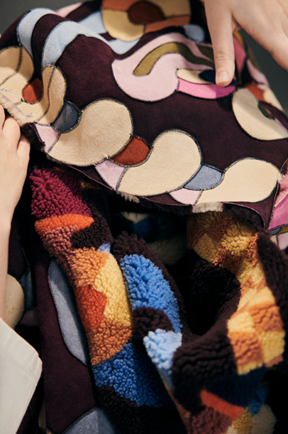 Considering the origin story of sheepskin as a material and its inherent link with humankind for millennia, a bucolic narrative of heaven and earth unfolds across two themes: “La Prairie” and “Le Firmament”. In the former, a flourish of looped ribbons and bows, geometric leaves and blossoms weaves across a magical meadow, whilst the latter looks upward to the heavens, depicting a sky blanketed with western stars, striped beads and curls of paisley.