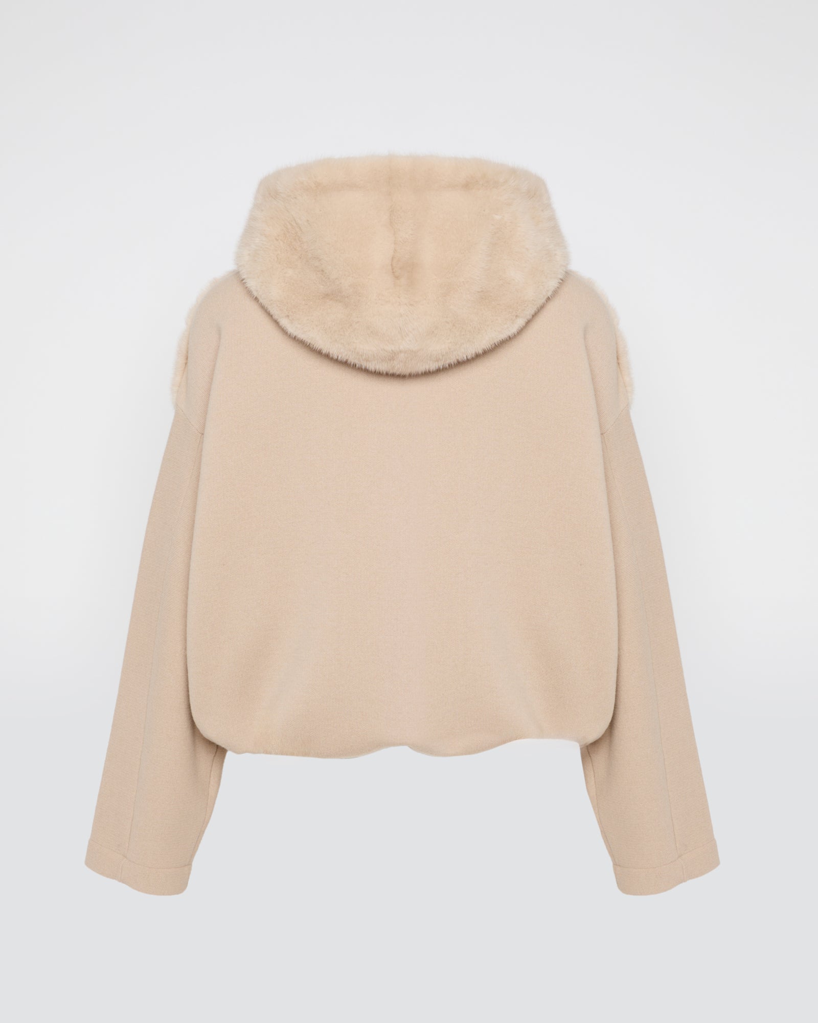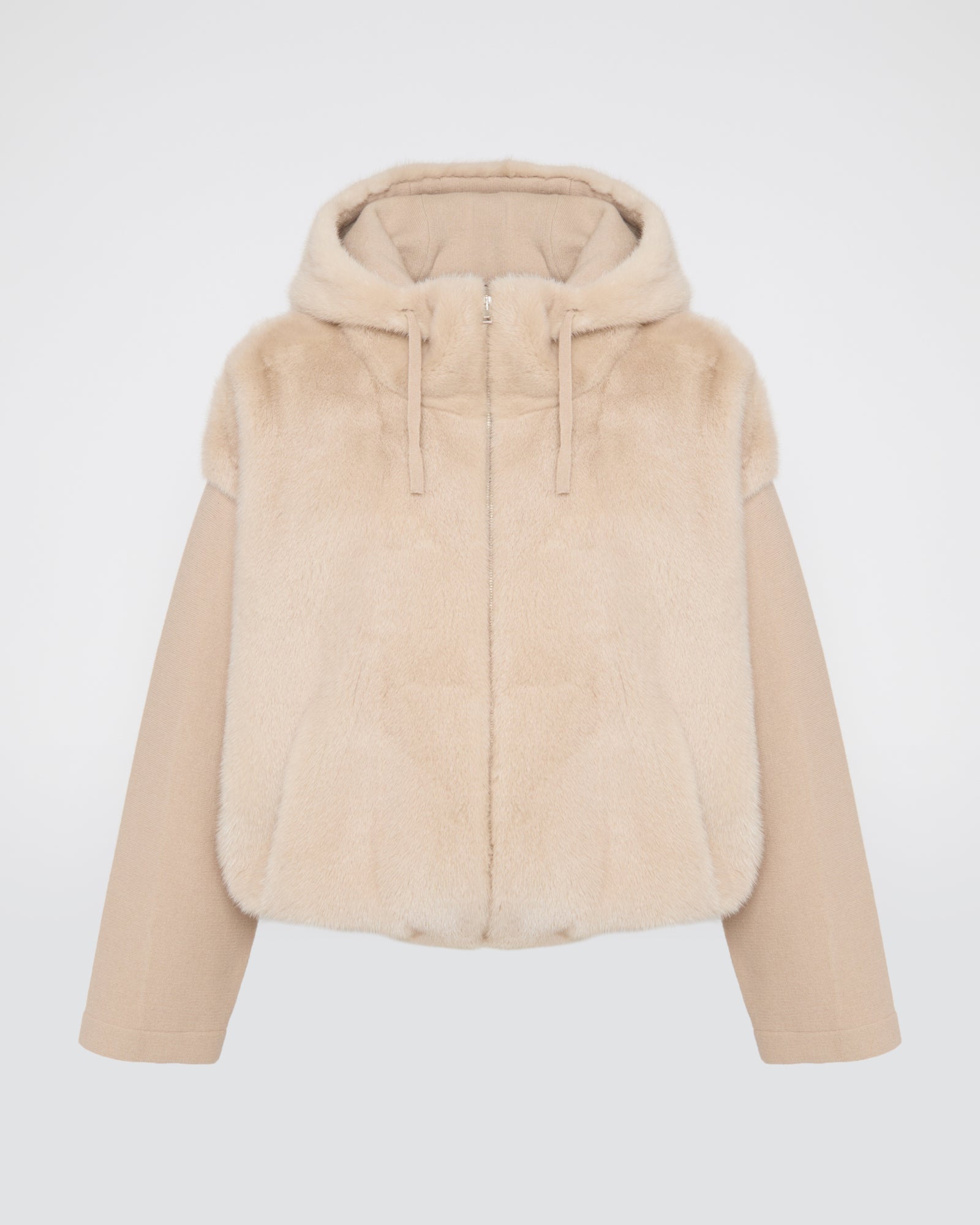 A versatile zip-up jacket that reinterprets sportswear codes uniquely. Crafted from cut-and-sewn knit with a mink fur hood and front, this style combines comfort with elegance for a chic, relaxed look that works in any situation.