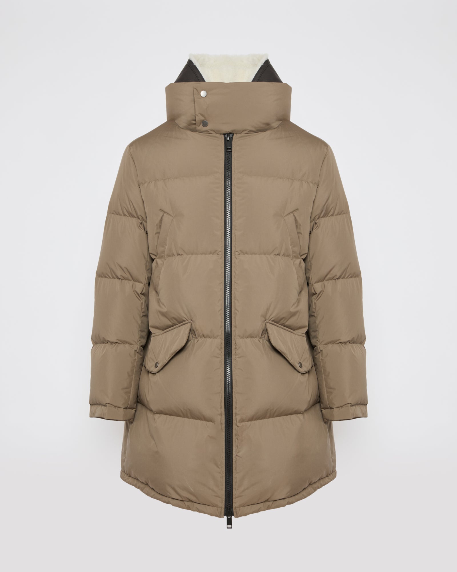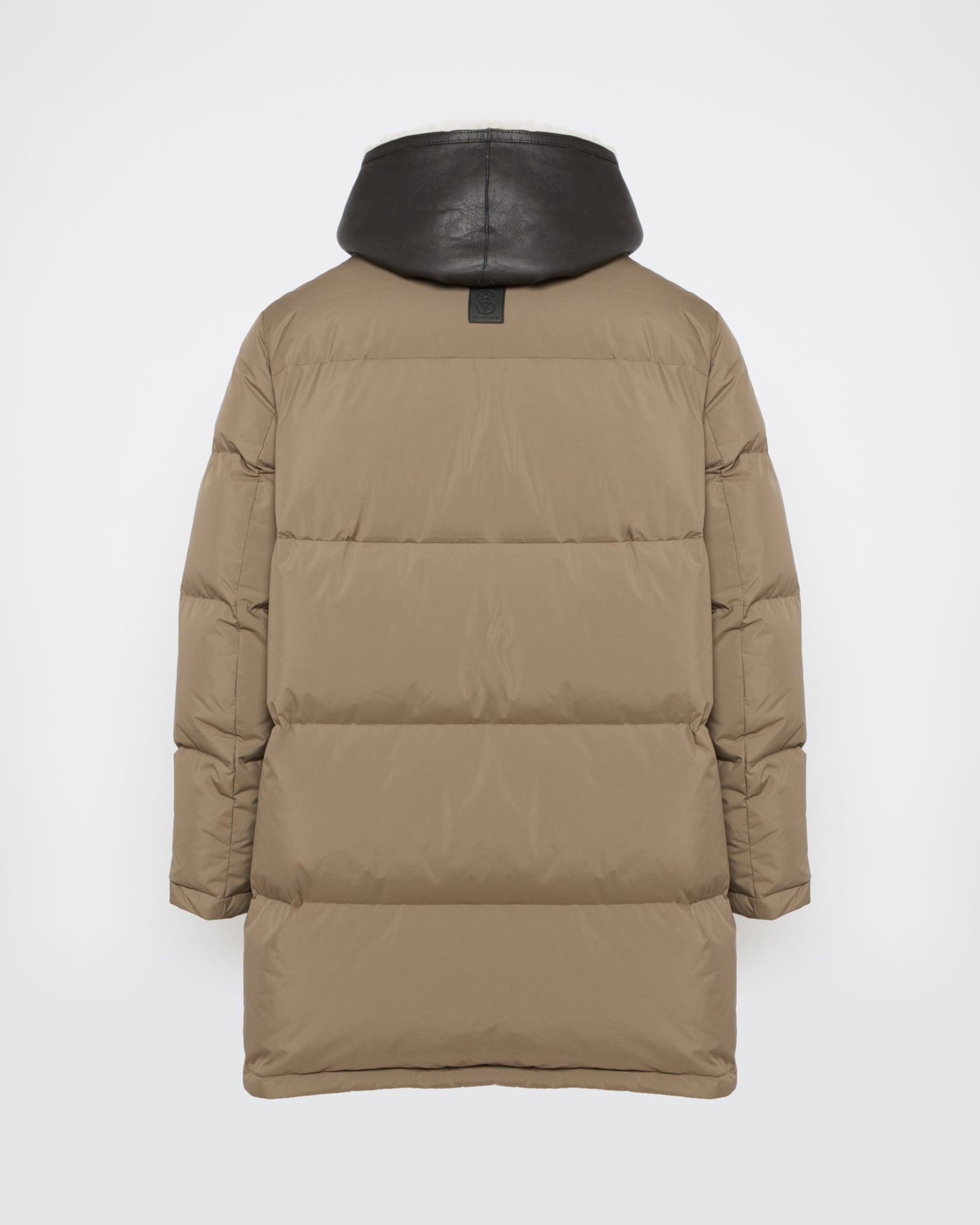 Worked in a weather-resistant technical fabric, this down jacket has been tested to -10°C for guarantee optimal protection against the cold. Its classic shape features a removable hood bib in soft Merino shearling, which brings a visual and textural contrast with its wool and nappa faces.