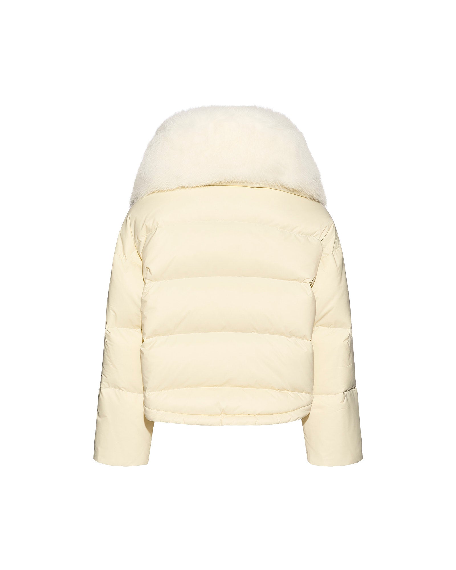The short shape of this quilted parka can also be worn cinched at the hem. The jacket has been tested to -10°C to guarantee a perfect protection against the cold, while its waterproof cotton fabric is storm-resistant. A removable collar in long-haired, soft fox fur provides style and warmth.
