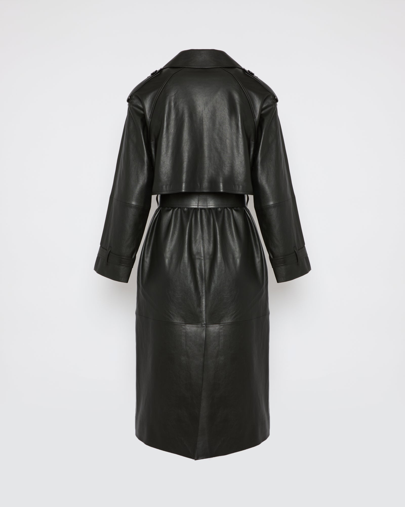 The uncomparable attitude of the perfect trench coat, worked in soft, smooth lambskin with a perfect fall. Its double-breasted front and shouder tabs provide instant sophistication. A matching belt allows its perfectly cut, slightly oversized volume to be worn cinched.