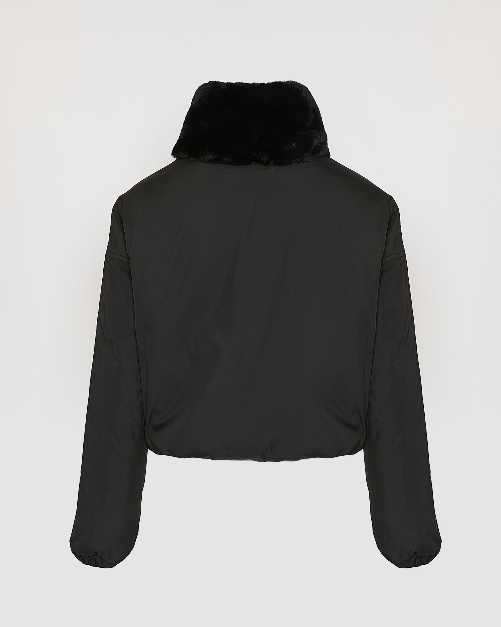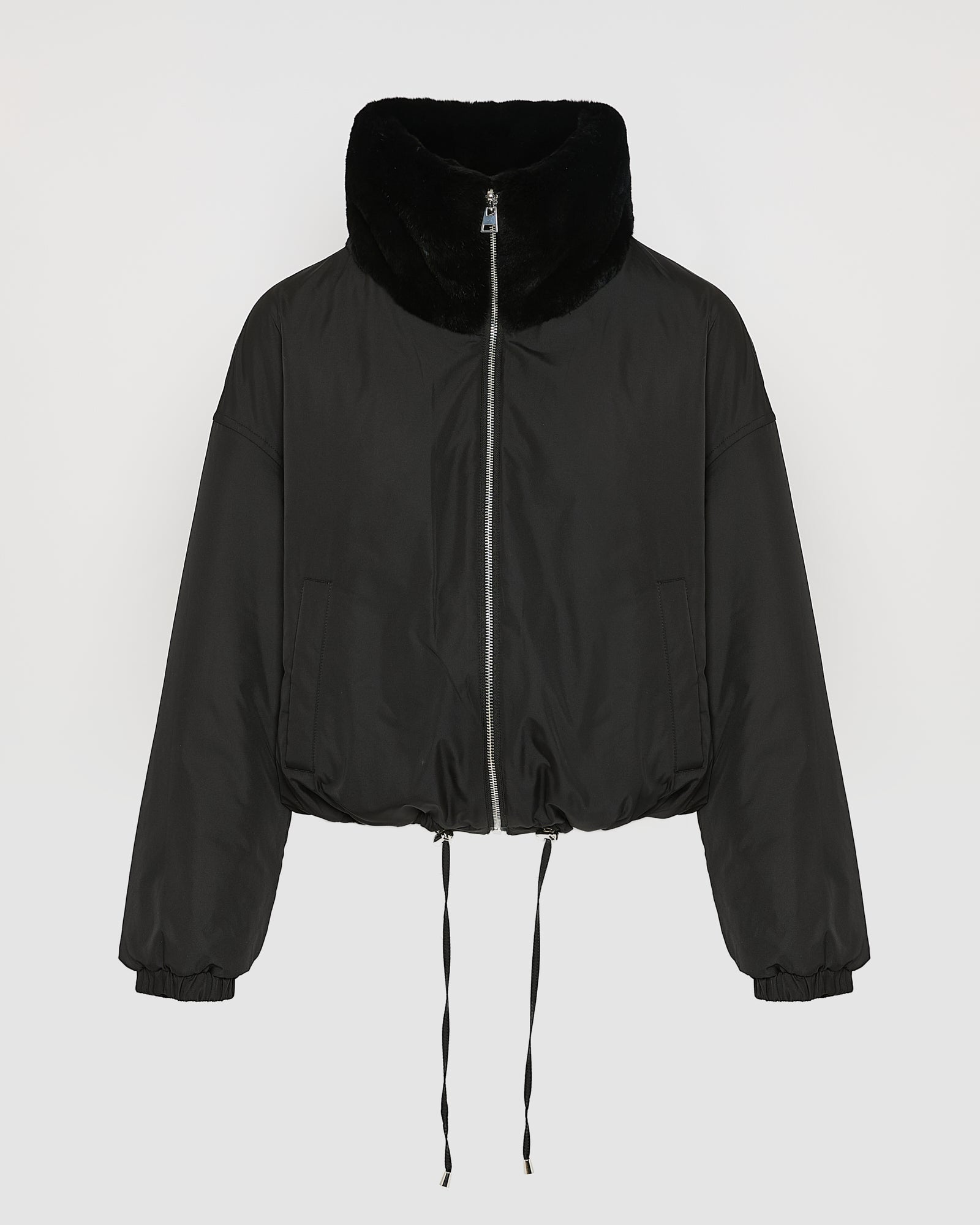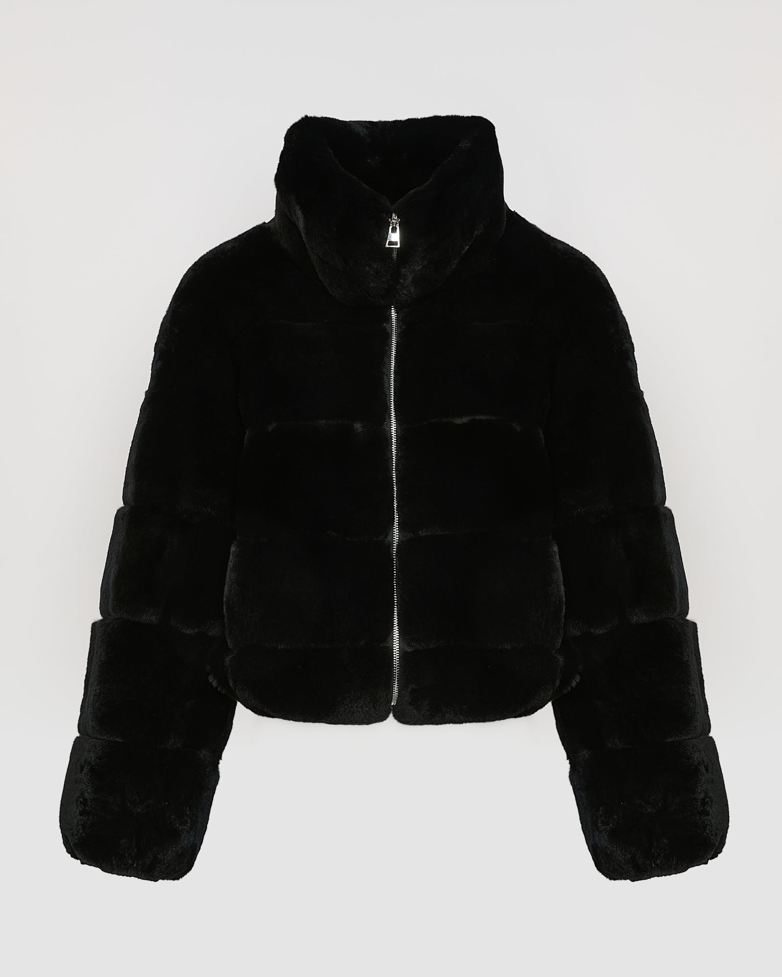 Versatility and contrasting textures for this sporty hooded jacket, with a boxy cut. One face in technical fabric reveals another side in soft, thick rex rabbit fur, worked in strips like the padding on a down jacket. A flat collar displays the rex rabbit fur on both faces.