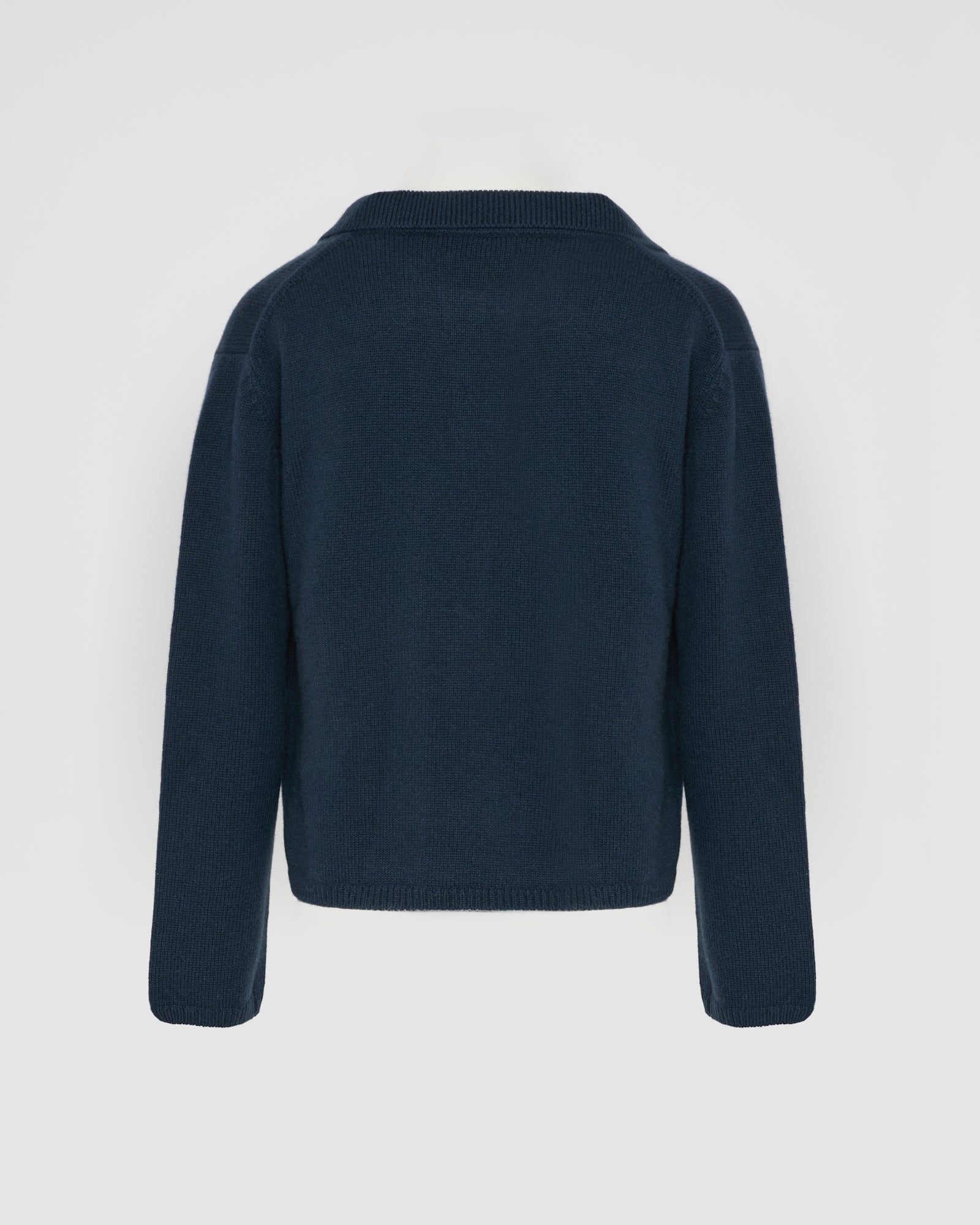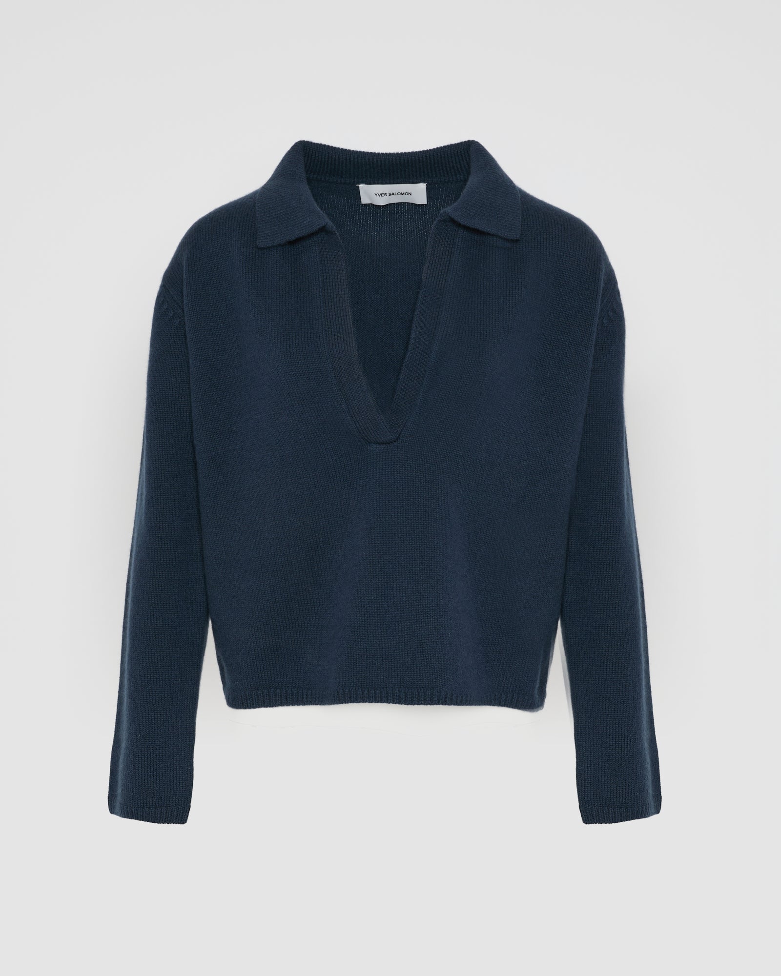 Des lignes épurées pour un pull court, tricoté dans une maille généreuse en laine et cachemire, qui propose une découpe col V à l'avant, ainsi qu'un col souple façon polo pour encadrer le visage.