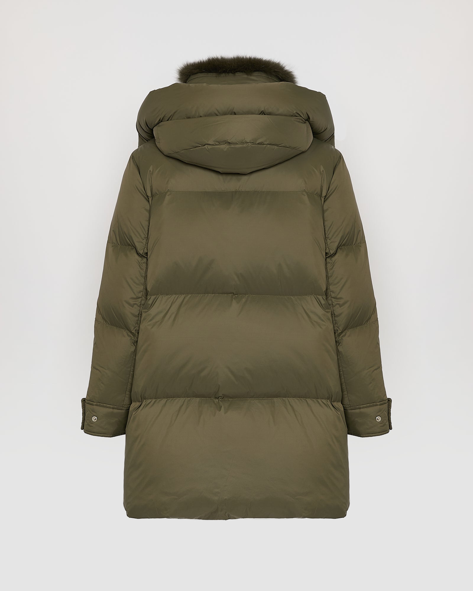 Légère et fonctionnelle, cette doudoune 3/4 en tissu technique déperlant est garnie de duvet et de plumes de canard de haute qualité pour garantir confort, chaleur et respirabilité. Les détails de conception comprennent une fermeture par zip et bouton-pression, deux poches plaquées à rabat, des pattes de resserrage ainsi que des finitions côtelées invisibles sur le bas des manches. Les fentes pressionnées sur les côtés ajoutent de l’aisance et une touche de modernité. Dotée d’une capuche détachable et d’une garniture de col amovible en renard, cette doudoune est versatile et intemporelle.