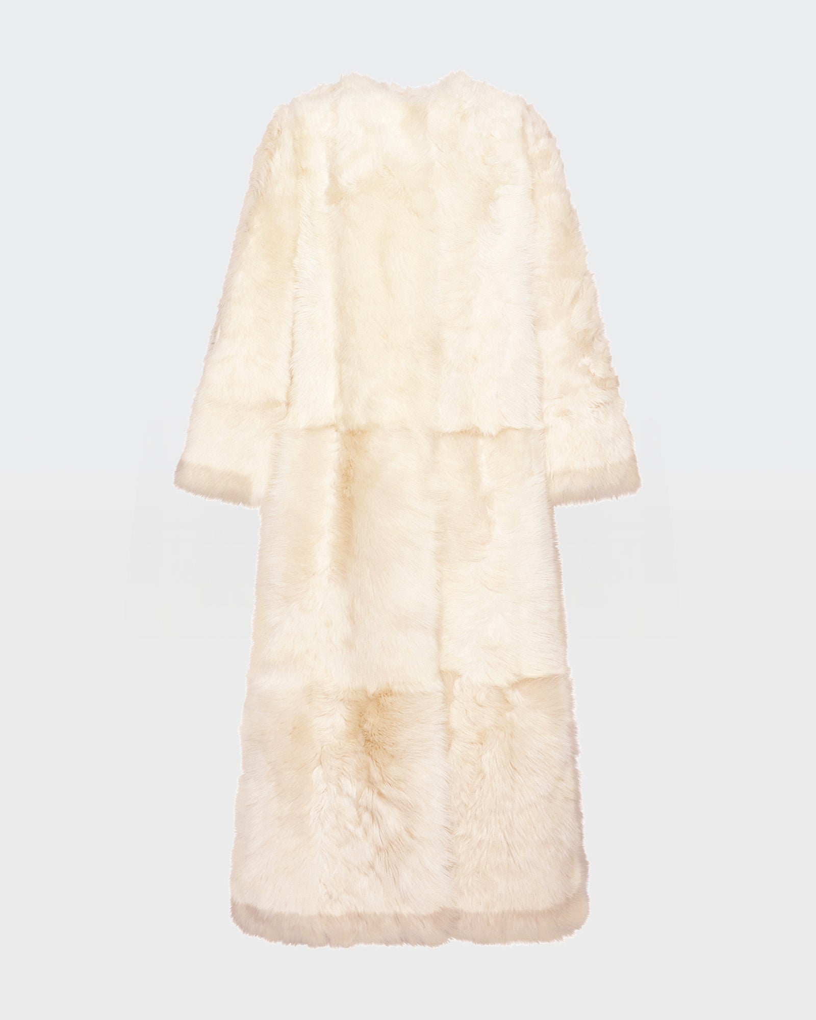 La matière généreuse de l'agneau Toscane est mise en valeur sur ce manteau long, qui peut également se porter fermé par une ceinture en cuir.