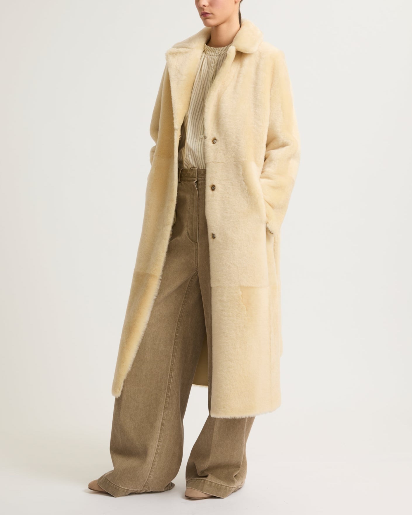 Manteau long et réversible au style masculin féminin. Confectionné en agneau, l’une des faces est en peau lainée tandis que l’autre est en cuir velours d’une grande finesse. À la fois chaud et enveloppant, il reste souple et agréable à porter. Doté d’un col tailleur et de deux poches fentes, sa ligne est épurée. La fermeture par boutons pression lui donne un aspect fonctionnel et la ceinture permet d’ajuster la silhouette pour une allure féminine et contemporaine.