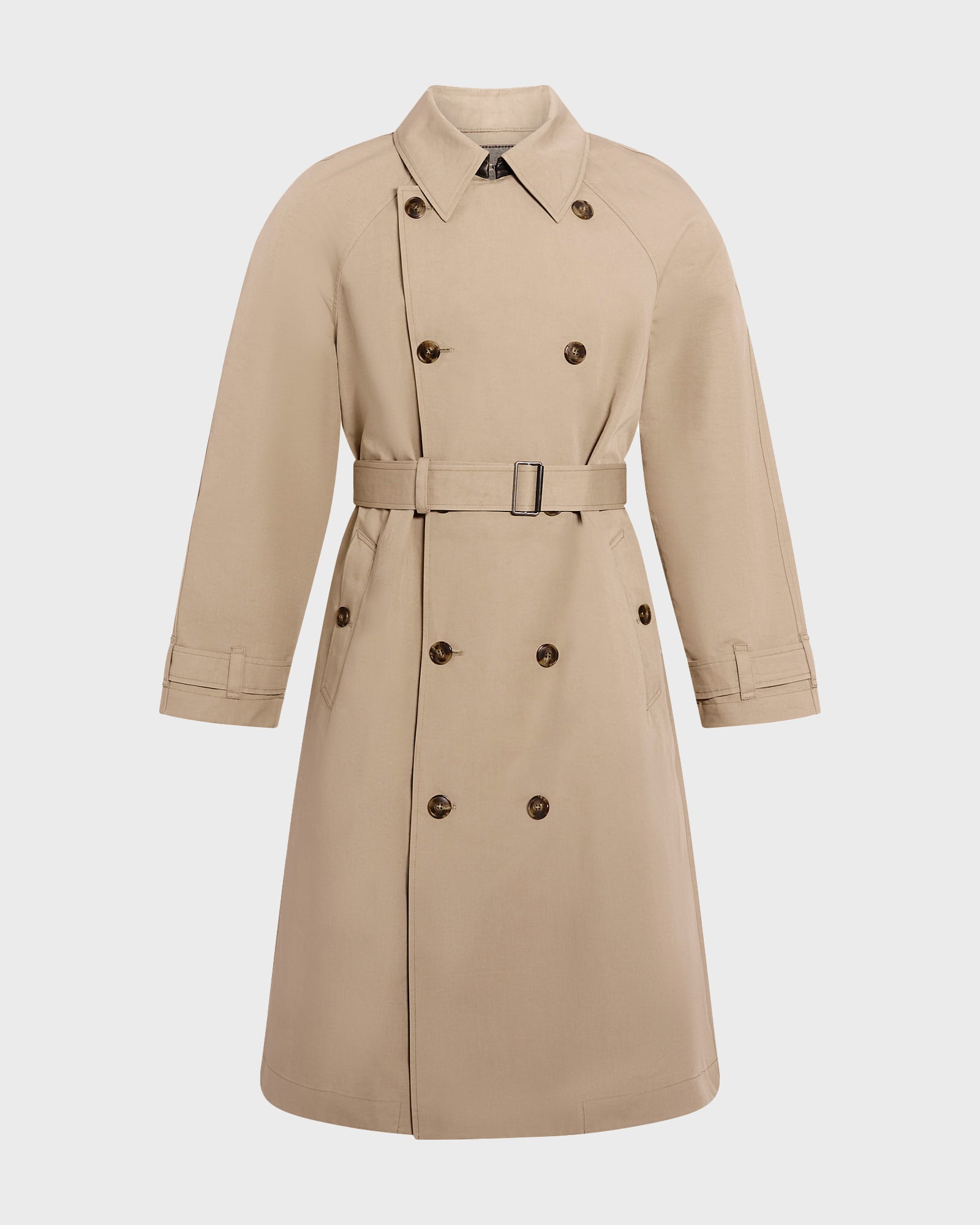 Le trench classique dans une version à double boutonnage, réalisé dans un tissu double face bicolore, traité avec un fini déperlant pour mieux affronter les averses estivales. Les finitions intérieures en cuir thermosoudé apportent un effet visuel et une protection supplémentaire. Ceinture à la taille et pattes de serrage aux poignets.