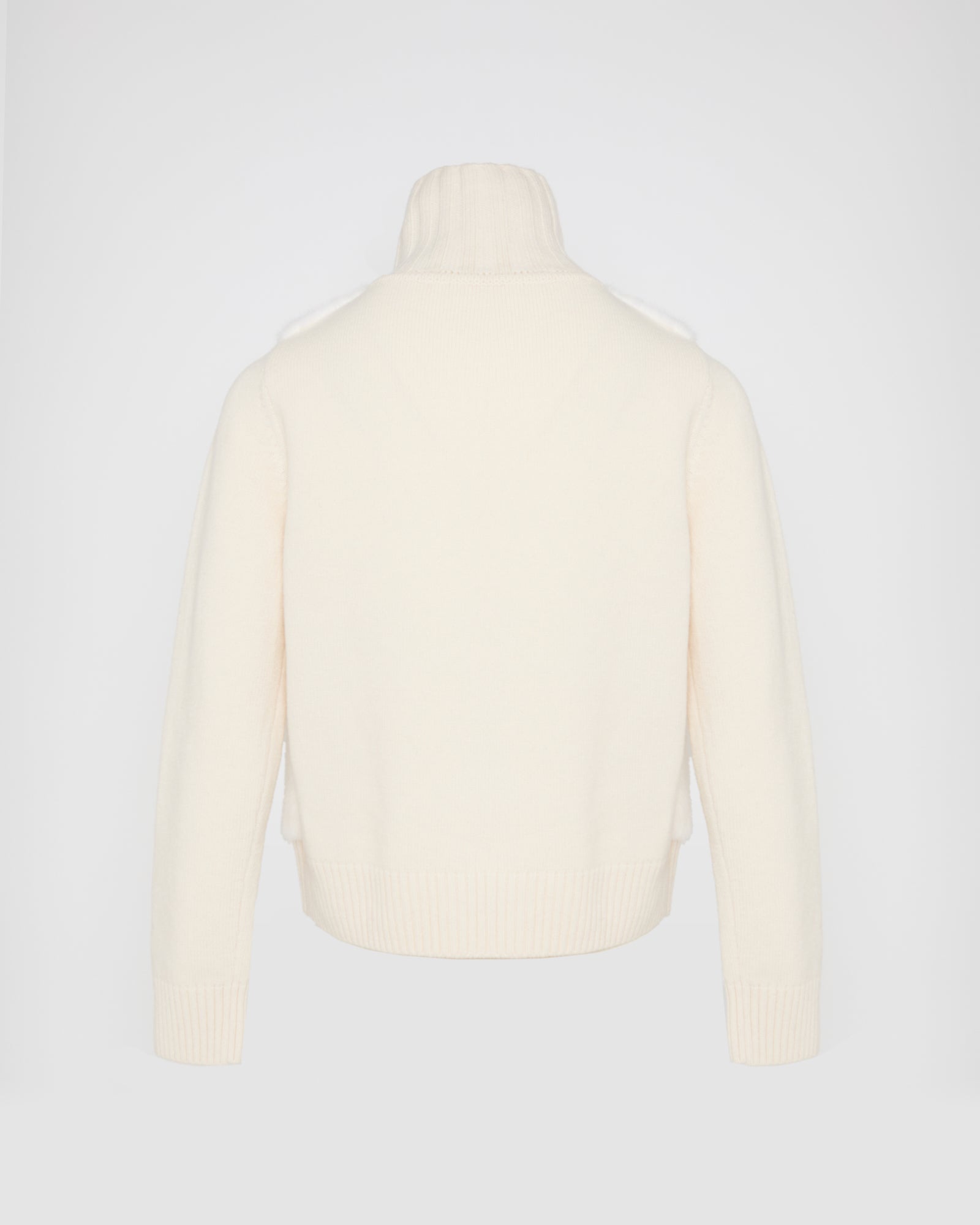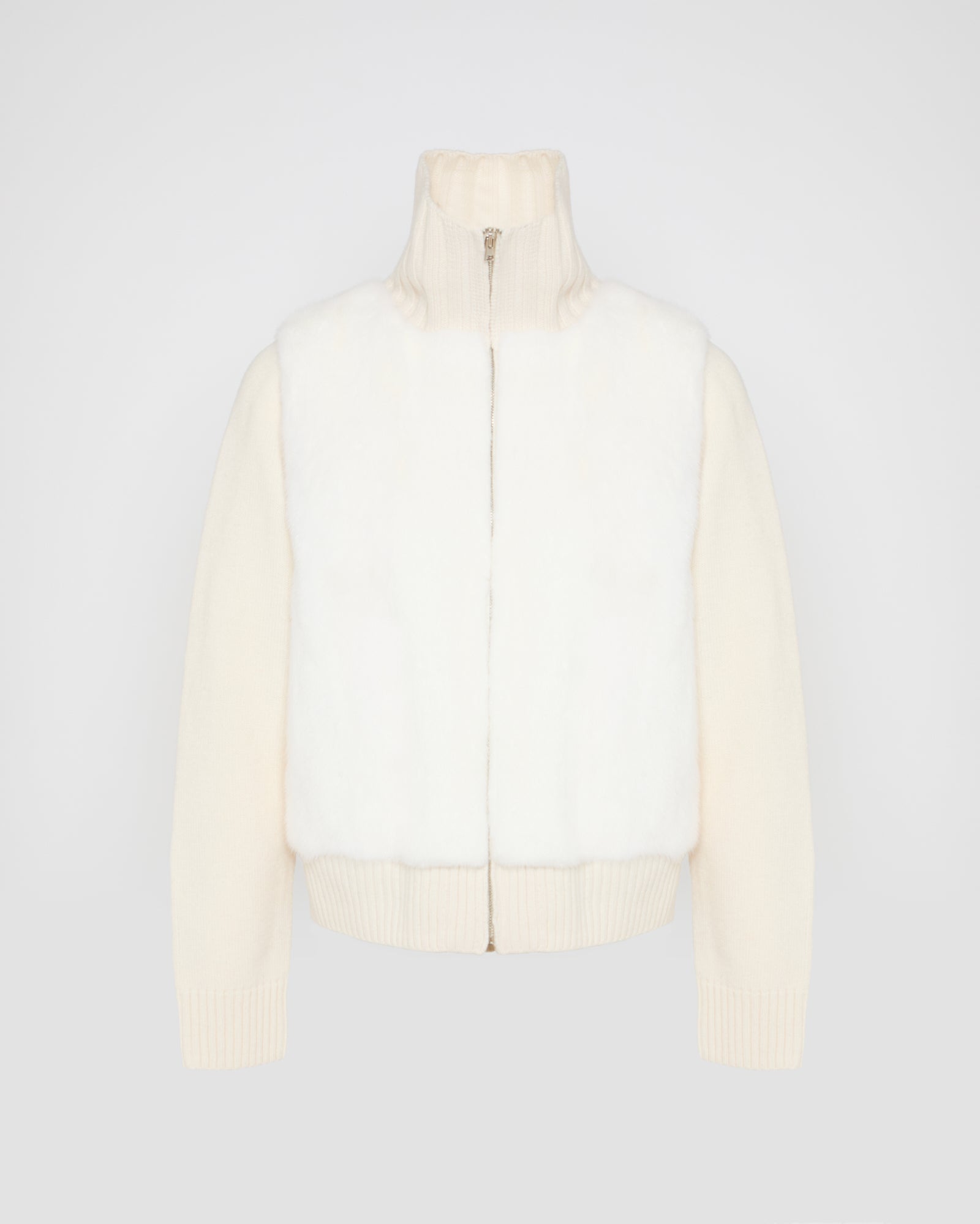 L'association savamment travaillée de la fourrure de vison long poil luxueuse et résistante, et d'une maille Mérinos. L'avant et le dos sont en fourrure, le col, les manches et l'ourlet en maille, dans une construction parfaitement maitrisée qui met an valeur le savoir-faire Yves Salomon.