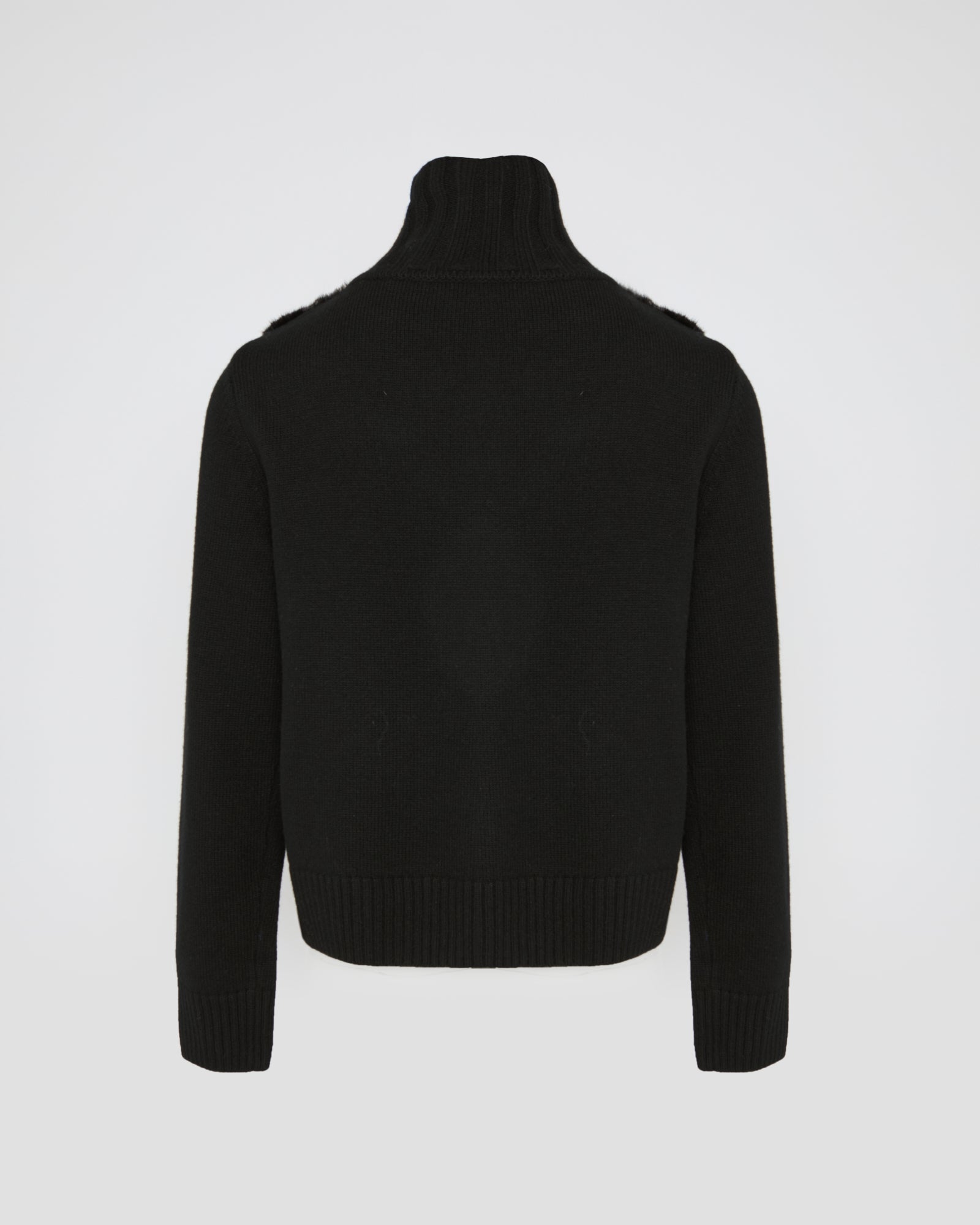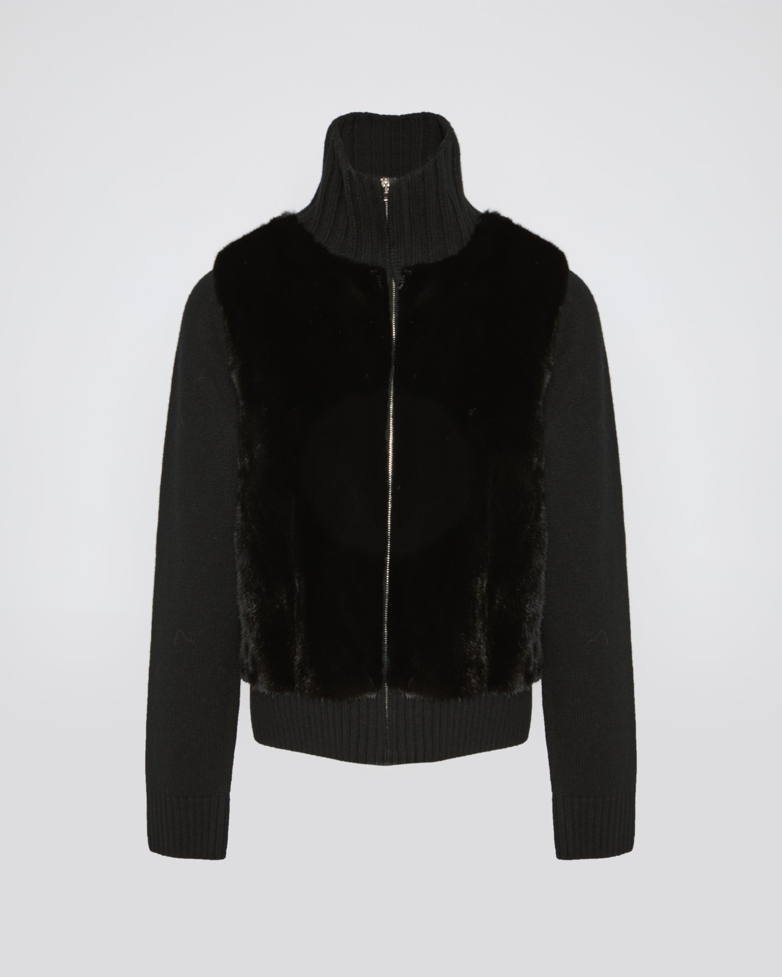 L'association savamment travaillée de la fourrure de vison long poil luxueuse et résistante, et d'une maille Mérinos. L'avant et le dos sont en fourrure, le col, les manches et l'ourlet en maille, dans une construction parfaitement maitrisée qui met an valeur le savoir-faire Yves Salomon.
